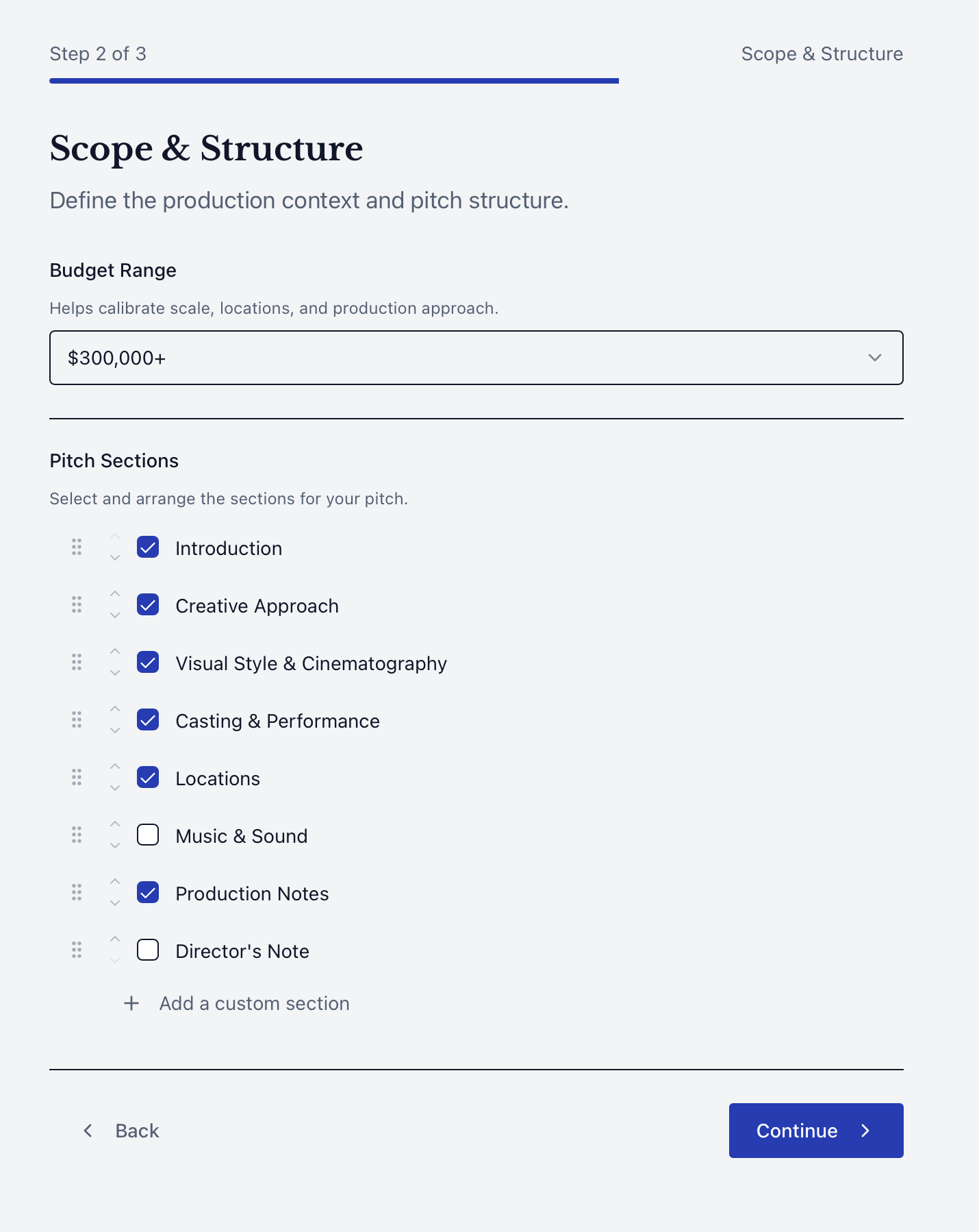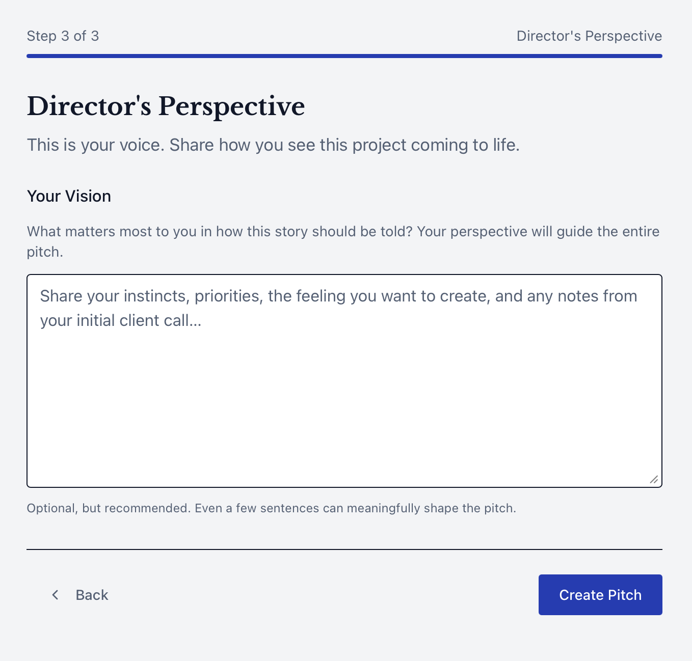 Rather than creating another deck builder, Pitch Dept was designed as a decision-making system that helps directors structure conviction before execution.
